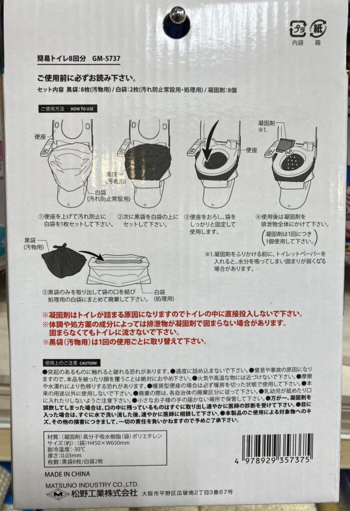 ダイソーの防災用品コーナーには、沢山の携帯トイレがありました。↓