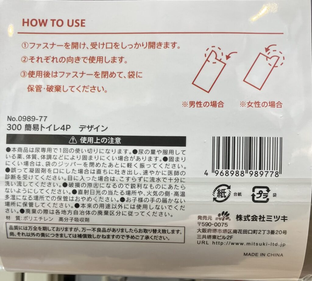 100均の非常用トイレは、ほとんどが尿専用の携帯トイレでした。