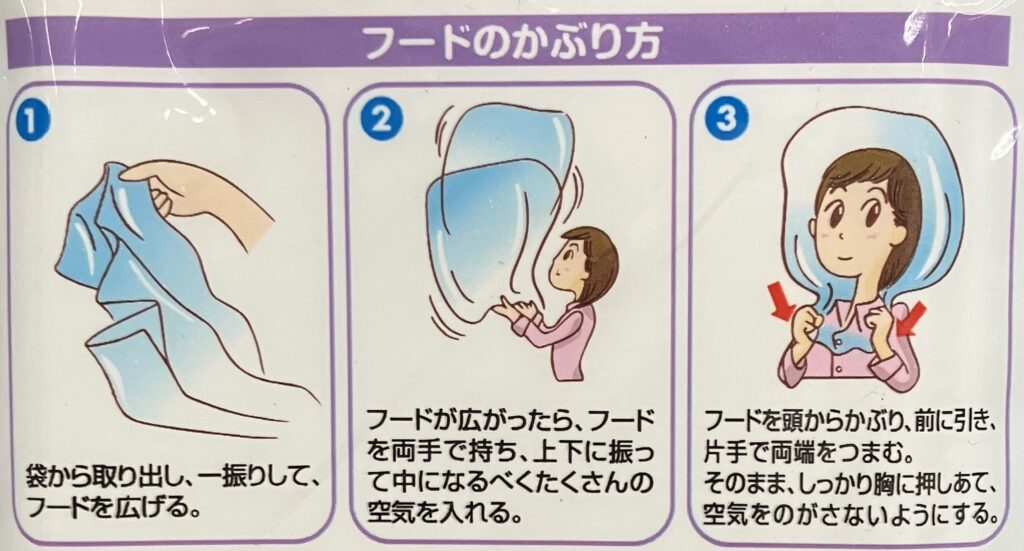 パッケージに加えて、頭に被る袋にも使い方が書いてあるので、イザという時でも迷いません。