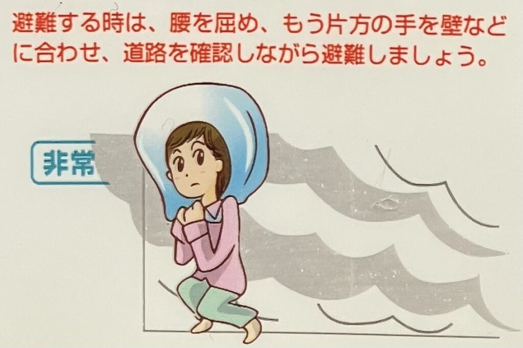 避難する時は、腰を屈め、もう片方の手を壁などに合わせ、通路を確認しながら避難しましょう。