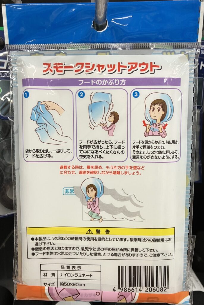 この袋をかぶれば、煙の中でも袋の中に酸素がある間(数分間)は逃げられます。