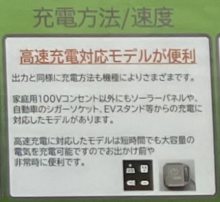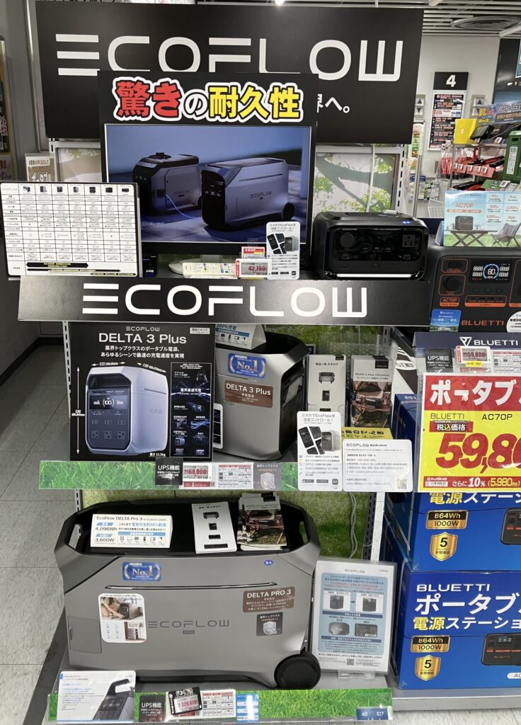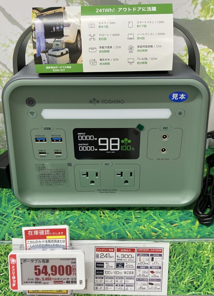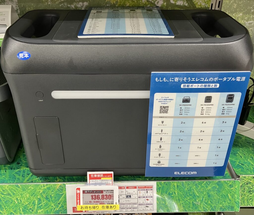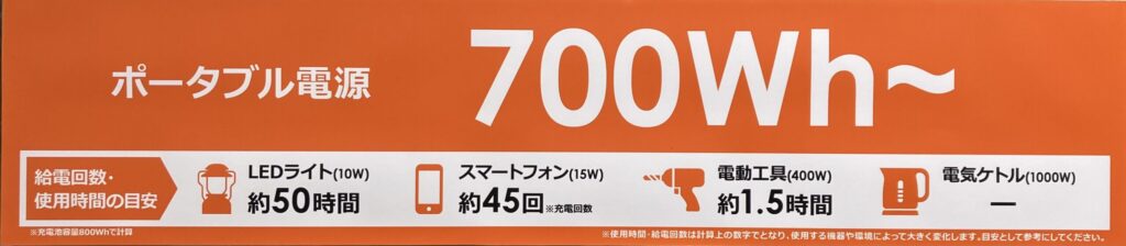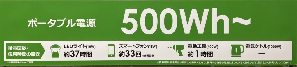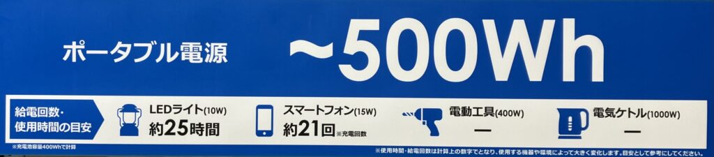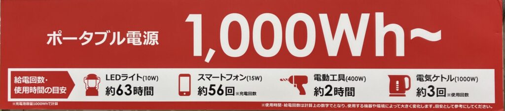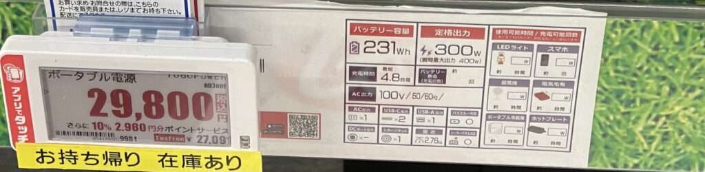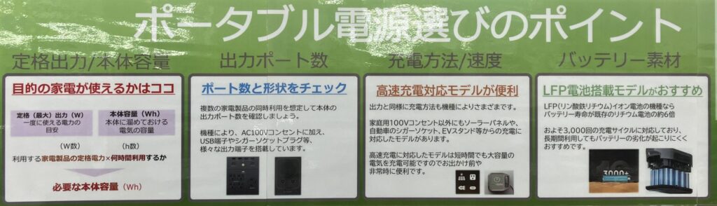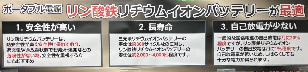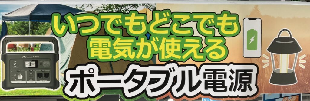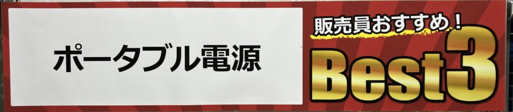 専用のポータブル電源売り場があり、こんな看板が天井からぶら下がっていました。
