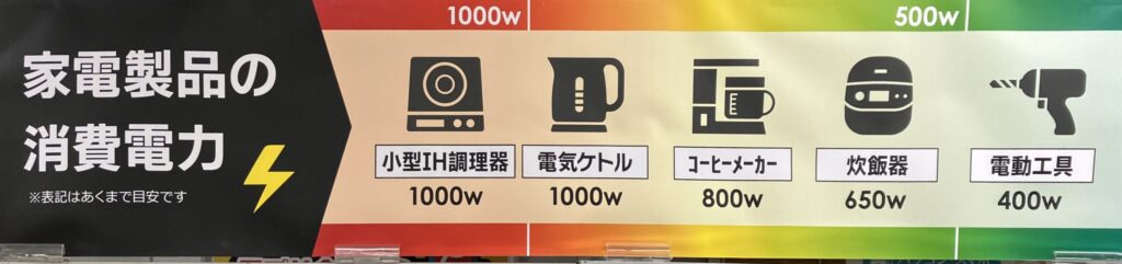 家電毎に消費電力が決まっていますので、お家の中で使いたい家電を調べて把握しておきましょう。