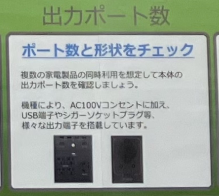 ポータブル電源の種類によって、出力ポートの種類と数が違います。