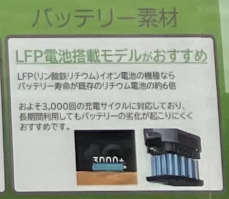 バッテリーの素材はいくつかありますが、これからはリン酸鉄リチウムイオンバッテリーがおすすめです。