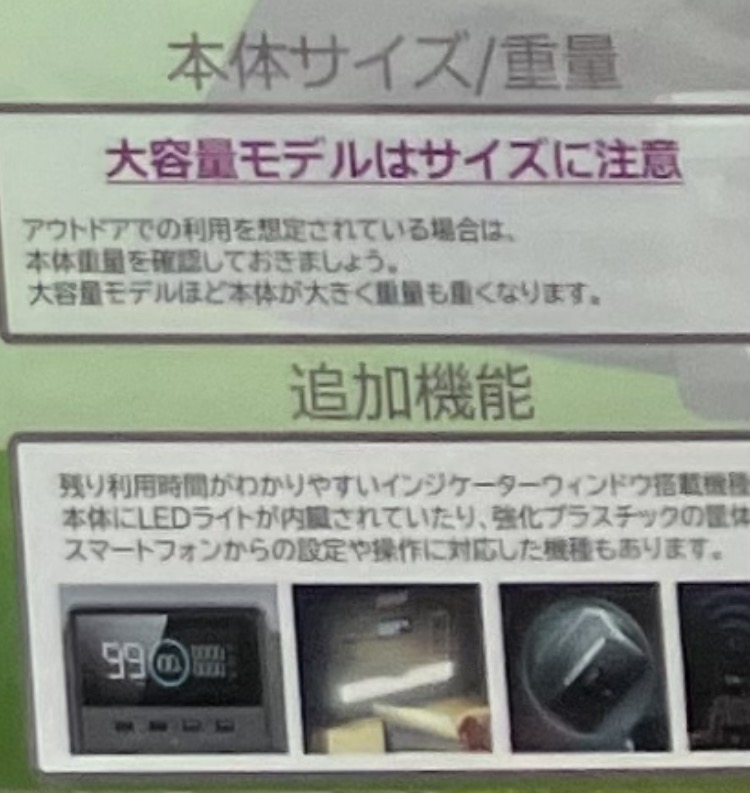 防災用途をお考えの場合は、停電が長引いた場合に備えて、ご予算・サイズ(置き場所)・重さ(運搬のし易さ)の許す範囲で、大容量がおすすめです!