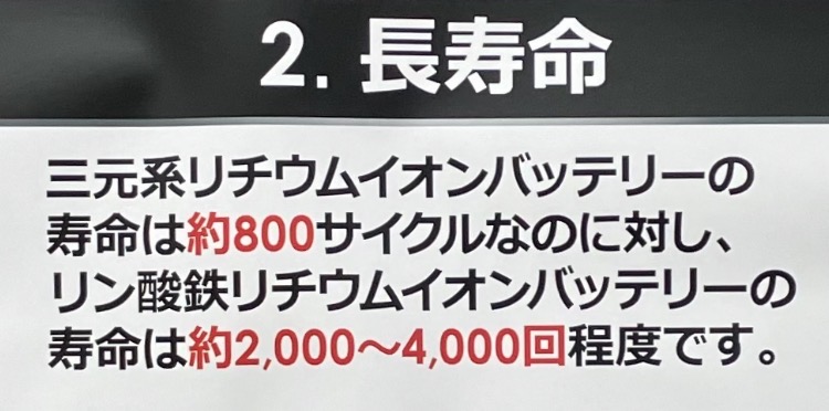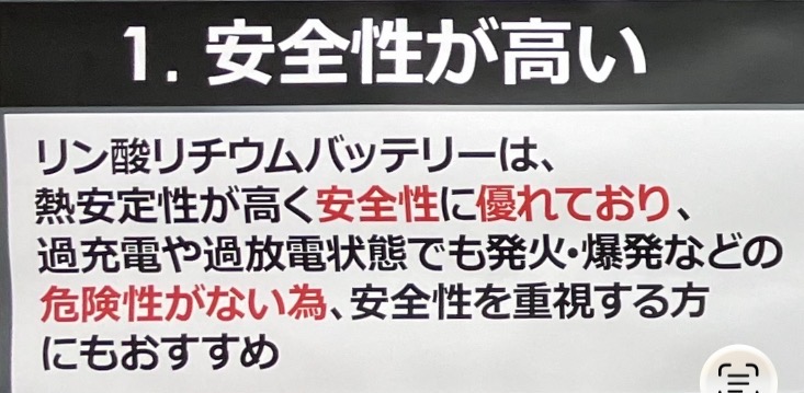 というわけで、今からもしもに備えて電気を備蓄するには、リン酸鉄リチウムイオンバッテリーがおすすめです。