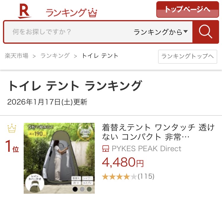 こちらのテント、楽天市場の「トイレテントランキング」で第1位を獲得しています。