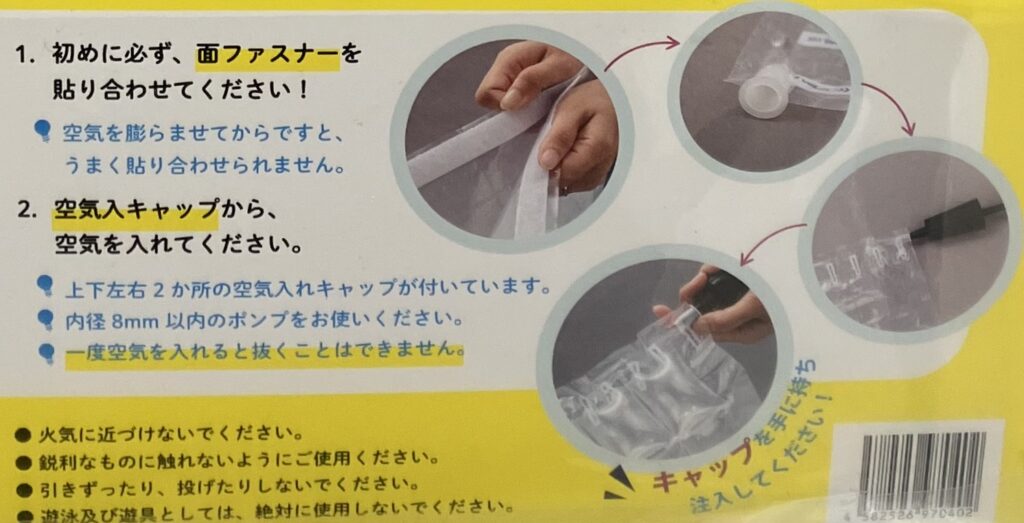 青色のキャップを外し、エアーポンプ(別売)または、口で空気を吹き込み膨らませます。