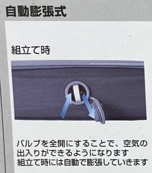 ポリエステルの生地に入ったポリウレタンのマットに、自然に空気を吸い込んで膨らむタイプ - エアーベッド: