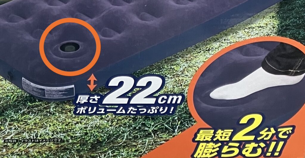 エアーベッドの隅にフットポンプが内蔵されているので(上図左の丸印)、その部分を繰り返し踏むだけで空気が入ります。
