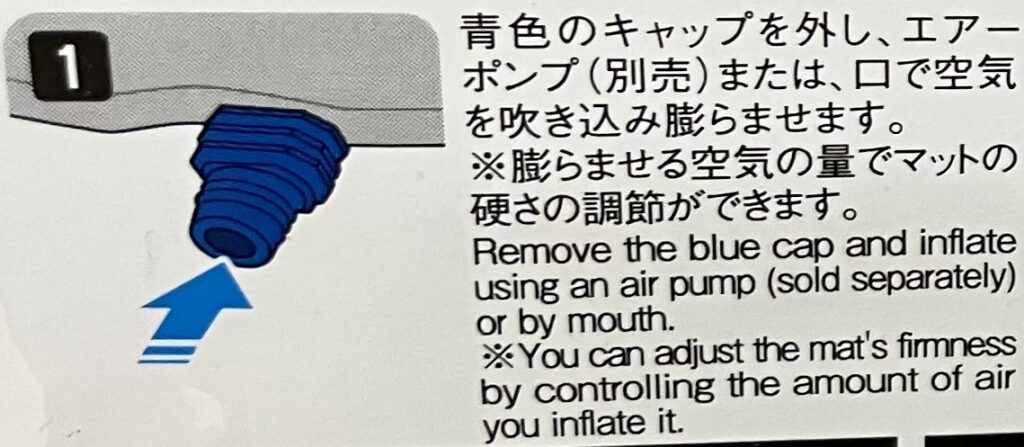 ①青い栓を開き、付属の空気入れのノズルを、真っ直ぐゆっくりと止まる位置まで差し込んでください。