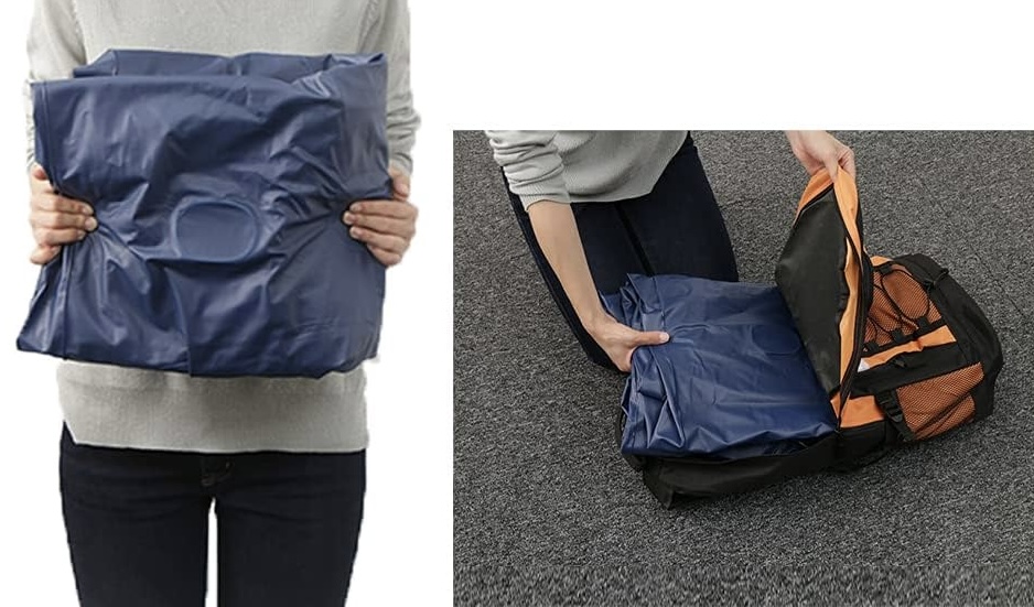 ビニール袋に薄く折り畳まれて入っており、重さは約0.6kgと軽いので、防災バッグの隙間に入れて持ち運べます。