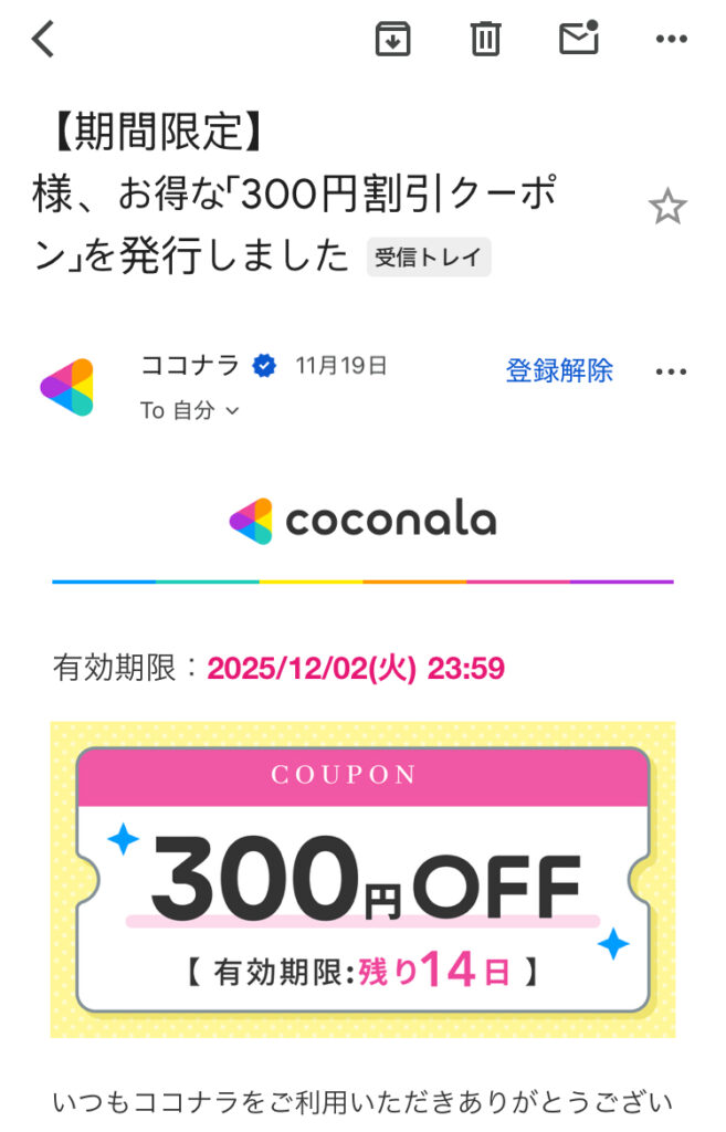 さらに、会員登録後しばらくすると、定期的に以下のような【期間限定】の「300円割引クーポン」がメールで配信されてきます。(これは使用期限があります)