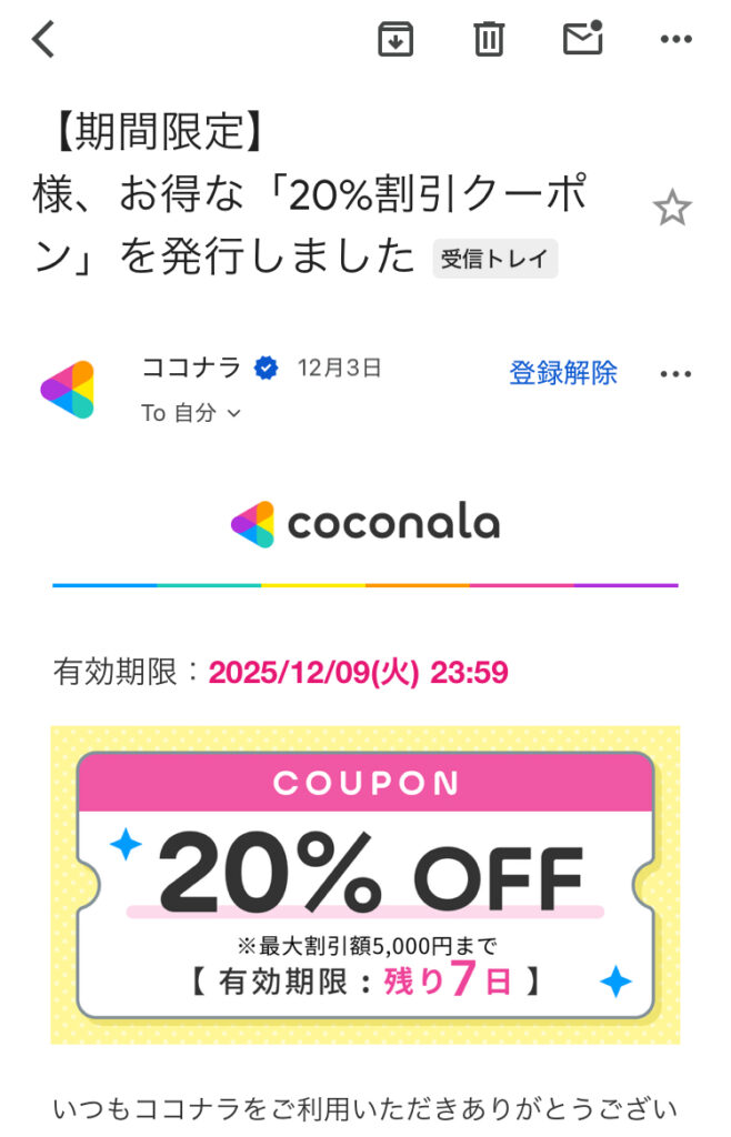 さらに、会員登録後しばらくすると、定期的に以下のような【期間限定】の割引クーポン」がメールで配信されてきてお得です。(これは使用期限があります)