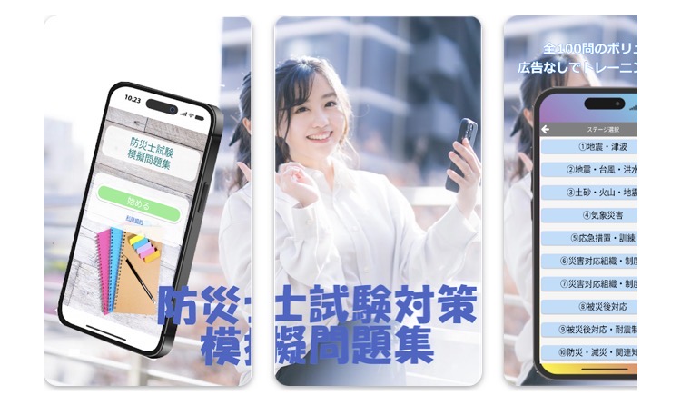 アプリの内容は、防災士試験対策用のオリジナル問題集です。